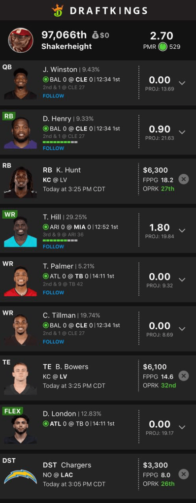I actually was able to min cash last week with a Darnold – Jefferson – Gibbs lineup that really looked like shit once you scanned the rest of it. Nabers had his worst week on the job and I inexplicably played Tim Patrick. Why would I ever play Tim Patrick. This week I’m going to reveal my lineup at noon.